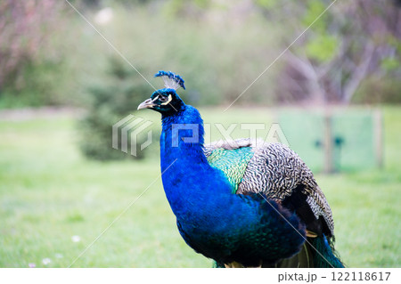 優雅に芝生の上を行くきれいな藍色の首周りの羽をもつ大きな孔雀 ロンドン郊外のキューガーデンにて