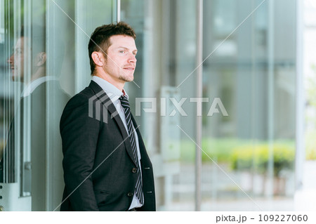 ビルの前に立つ欧米人ビジネスマン・海外出張・海外赴任・商社・貿易