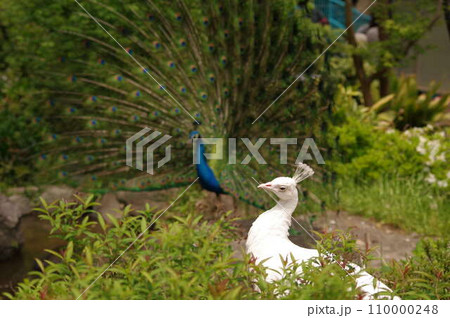 知らんふりの雌の白孔雀にプロポーズの雄印度孔雀