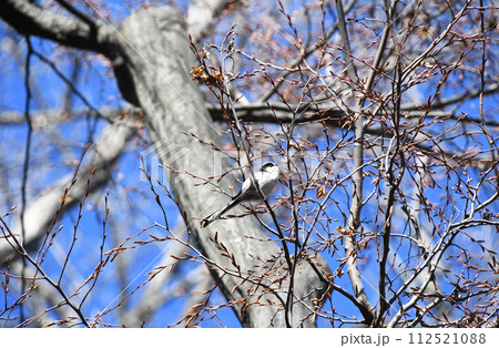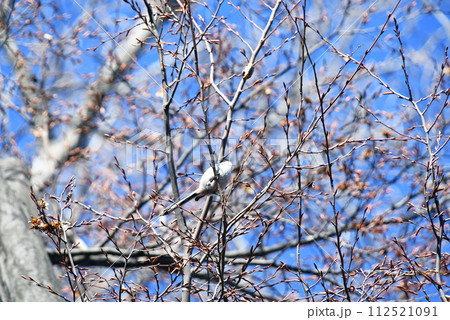 東京都三鷹市の野鳥 仙川公園遊歩道の桜の枝にとまるエナガ