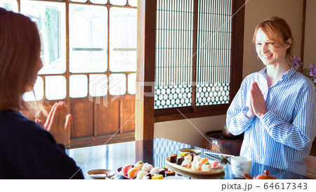 「いただきます」の合掌をする外国人女性