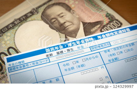 年金額改定通知書と年金手帳と一万円札 老齢基礎年金 遺族基礎年金
