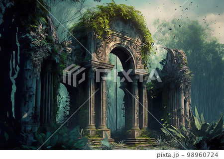 Ancient temple in jungle, old ruins in tropical forest and water, generative AI