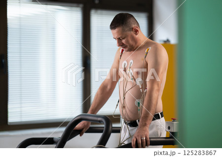 A middle-aged man is undergoing a medical stress test on a treadmill, connected to ECG electrodes for heart monitoring in a clinical environment