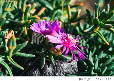 日差しを浴びて鮮やかに咲く紫色のマツバギクと多肉質の葉