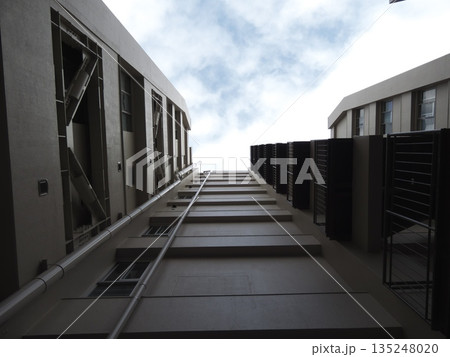 高層マンションの隙間から見上げる冬の空。都会の巨大な建築群が織りなす幾何学的なパースペクティブ。