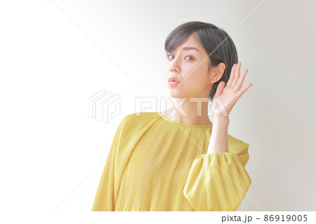 耳に手を当てて聞き耳を立てる女性2