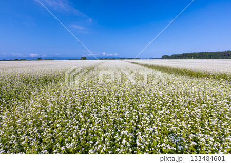 福島県耶麻郡猪苗代町金田 猪苗代湖畔の見渡す限りの蕎麦畑 満開の白いソバの花