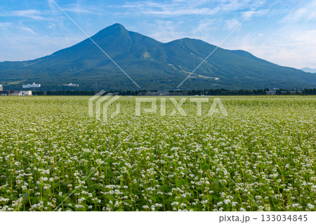 福島県耶麻郡猪苗代町磐里村北 見渡す限りの蕎麦畑のソバの花と後ろにそびえる磐梯山