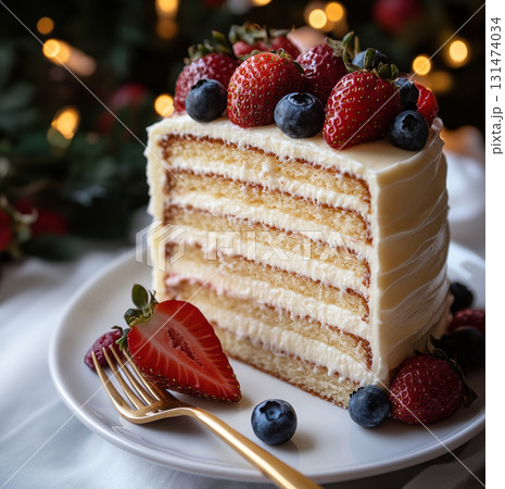 Delicious layered cakes with blueberries and strawberries arranged neatly on a display tray in a bakery