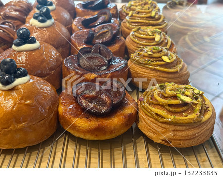 Assorted pastries with blueberries, plums, and pistachios in bakery display. Sweetness, texture, and craftsmanship in artisanal dessert presentation.
