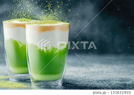 Matcha latte in clear glasses with creamy foam and vibrant green layers on a textured surface