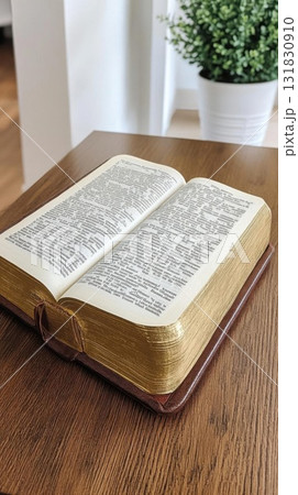 Bible on a wooden table with a flowerpot in the background