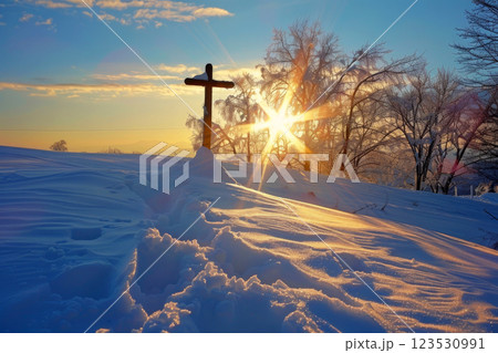 Wooden cross stands in the desert, rays of sunlight. Generative AI