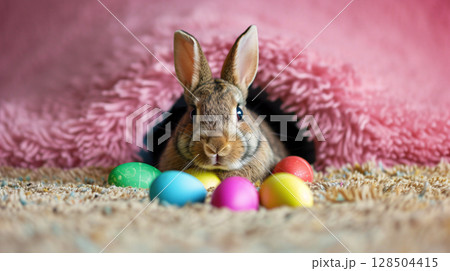 Easter bunny and Easter eggs with rabbit hole on pink background. generative ai