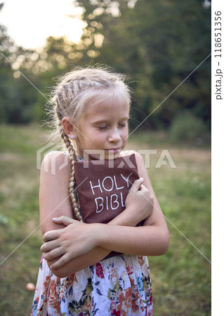 little girls sisters pray to god at easter picnic in garden