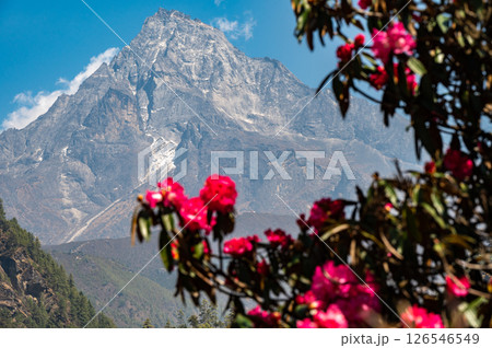 Mt.Khumbila (5,761 m) with Rhododendron flowers. This mountain translated as "God of Khumbu" in the Khumbu region of Eastern Nepal. The mountain is considered home to the patron God of the local area.