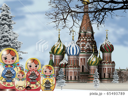冬のモスクワ風景とマトリョーシカ人形のイラスト