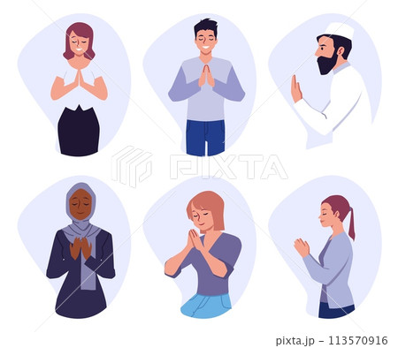 Prayed people, set of cartoon style vector illustration on white background