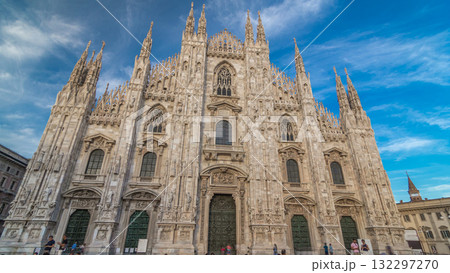 The Duomo cathedral timelapse hyperlapse at sunset. Front view with people sitting on stairs