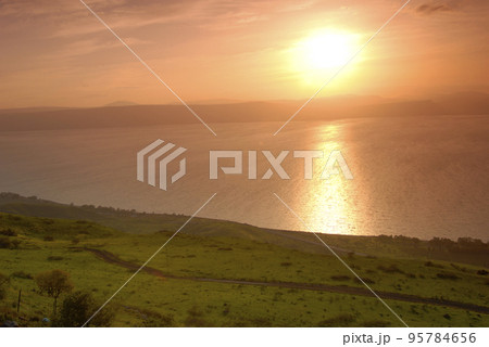 聖書の国イスラエル北部にあるガリラヤ湖の夕日