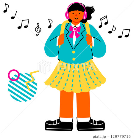 ヘッドホンで音楽を聞いている女子学生のポップでカラフルなイラスト