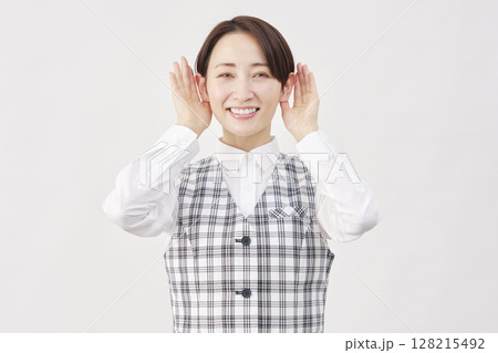 女性 美容看護師 耳に手を当てて聴く 白背景
