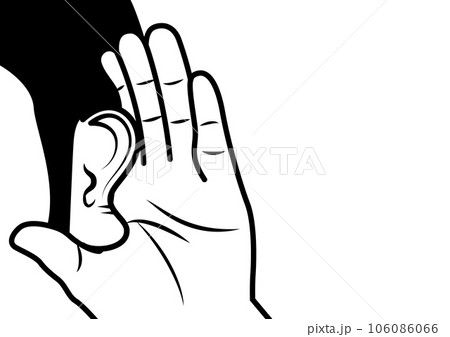 聞く耳の線画イラスト。耳寄りな情報。内緒話や聞き直す動作。は?え?のポーズ。