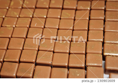 Luxury milk chocolates with golden details in a neat grid, gourmet artisan sweets