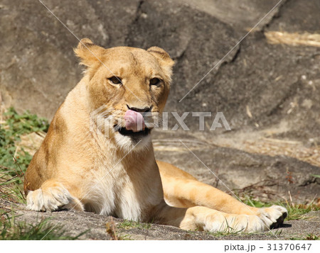[動物]岩場で寝そべるメスライオン(動物園の風景)