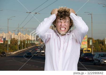 Portrait of a young man with curly hair having nervous breakdown outdoors. City street in the background.