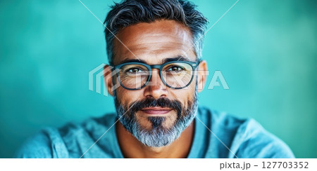 Man with gray hair and beard wearing glasses shows a confident smile against a vibrant blue background in a casual setting
