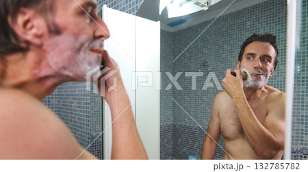 Man Shaving in Front of Bathroom Mirror, Foam on Face, Quiet Morning Grooming