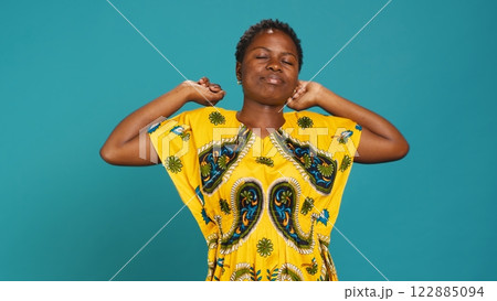 Casual young adult stretching and relaxing in the studio, wearing a traditional attire with floral native elements. Confident cheerful woman straightening her back, fixing her posture. Camera A.