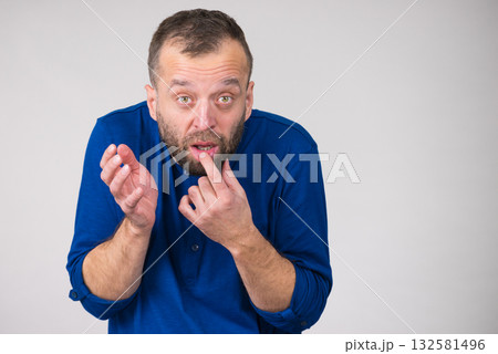 Tranquil curly man relaxing, meditating, refuses stress. Breathes deeply on blue