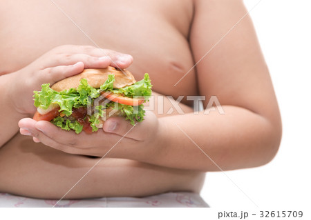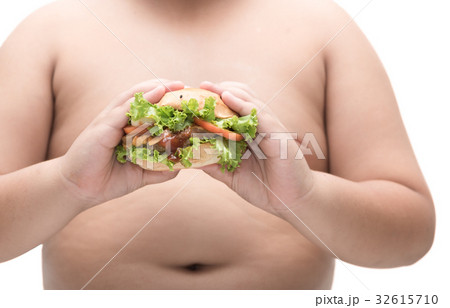 pork hamburger on obese fat boy hand