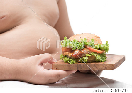 pork hamburger on wood plate and obese boy