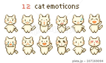 かわいい子猫の12の感情のアイコンセット、ドット絵ベクター素材
