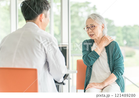 肩の痛みを医師に相談する中年男性(肩こり・四十肩・五十肩・過労)