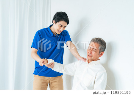 シニア男性の肩の痛みを診察するケアスタッフ
