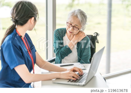 女性看護師・理学療法士に肩の痛みを相談するシニア男性(リハビリ・関節痛)