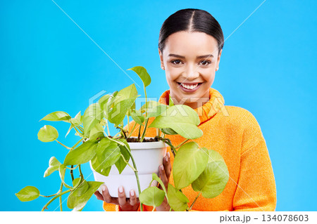 Portrait of woman with green plant, smile and happiness for house plants on blue background. Gardening, sustainable and hobby for happy face, gen z or girl on mock up for eco friendly garden shop.