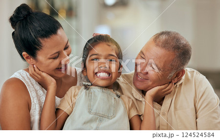 Child, grandparents and love of family with a smile, support and care in home living room together in Mexico. Portrait of girl kid, senior man and woman happy about quality time, hug and retirement