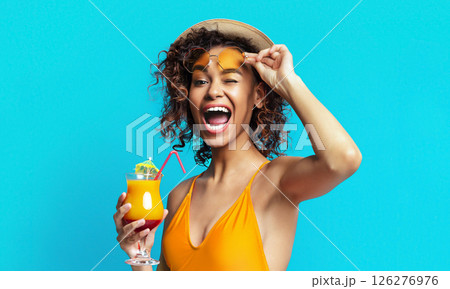 African American woman smiling and looking at the camera. She is wearing a yellow swimsuit, a straw hat, and sunglasses. She is holding a tropical cocktail in one hand