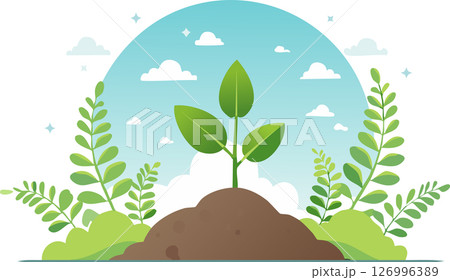 Young plant sprouting from soil under clear sky, surrounded by abstract leaves and soft clouds, minimal flat style with white background and copy space.