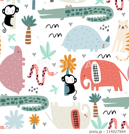 Seamless childish pattern with african animals. Creative scandinavian style kids texture for fabric, wrapping, textile, wallpaper, apparel. Vector illustration