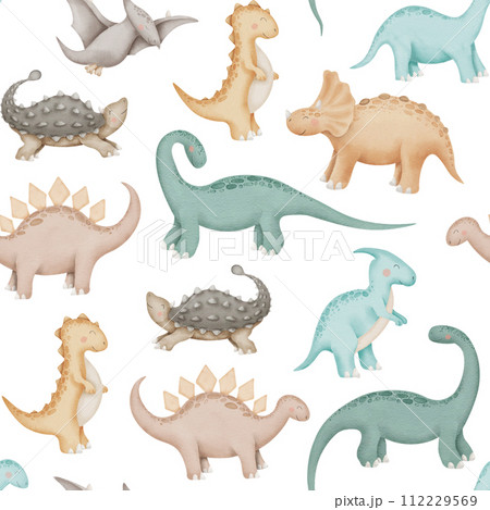 Dinosaurs Watercolor seamless Pattern. Cute dino Baby Print. Hand drawn on isolated white background. Cartoon animal character drawing. Funny illustration for fabrics and kids bedding.