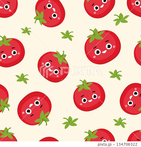 Seamless pattern with funny tomatoes and green leaves in cartoon style for children textiles
