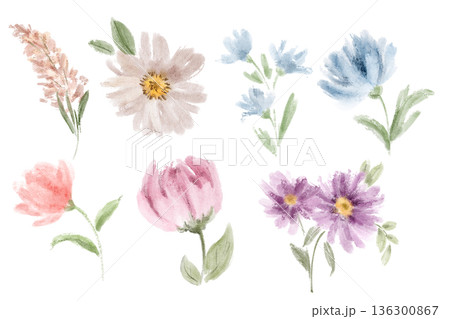 Watercolor set of delicate wild flowers with thin stems and soft pastel petals in pink peach and blue tones. Illustration for invitations, postcards, packaging, stationery or gentle floral designs.