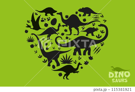 Prehistoric dinosaurs silhouettes in heart shape. Vector playful and artistic black shadows of dino spices and prehistoric elements like footprint trails and plants on a vibrant green background
